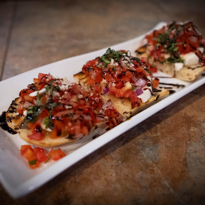 Olive tapenade, Infused chili oil, balsamic glaze & arugula