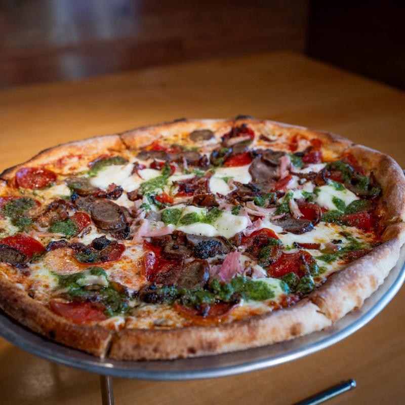 Italian sausage, pepperoni, maple peppercorn bacon, ham, fresh mozzerella & basil pesto drizzle | Sm $17 / Lg $24
