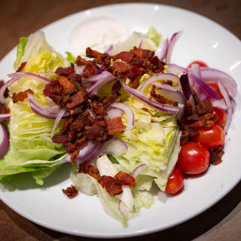 Iceberg lettuce, cherry tomato, red onions maple smoked peppercorn bacon, & blue cheese dressing