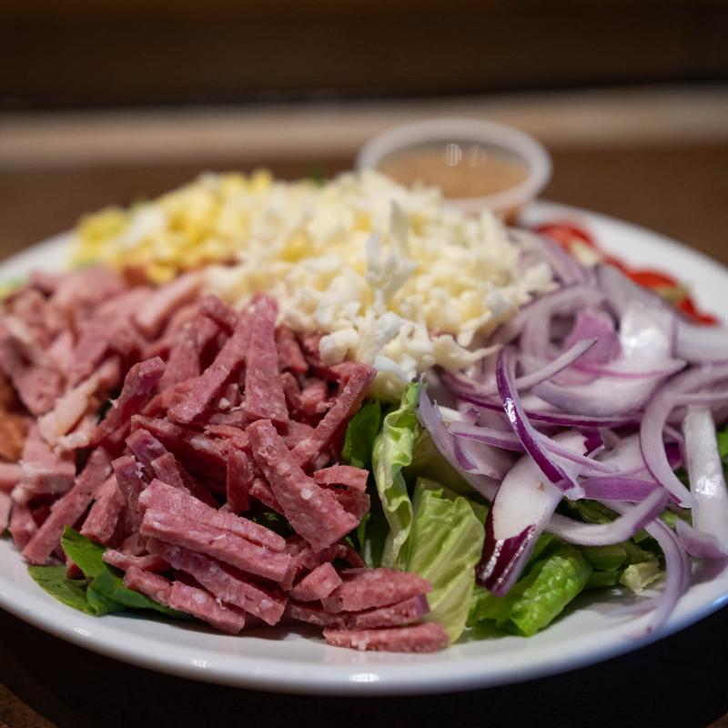 Romaine, genoa salami, ham, mozzarella, red onion, tomato, egg & red wine vinaigrette
